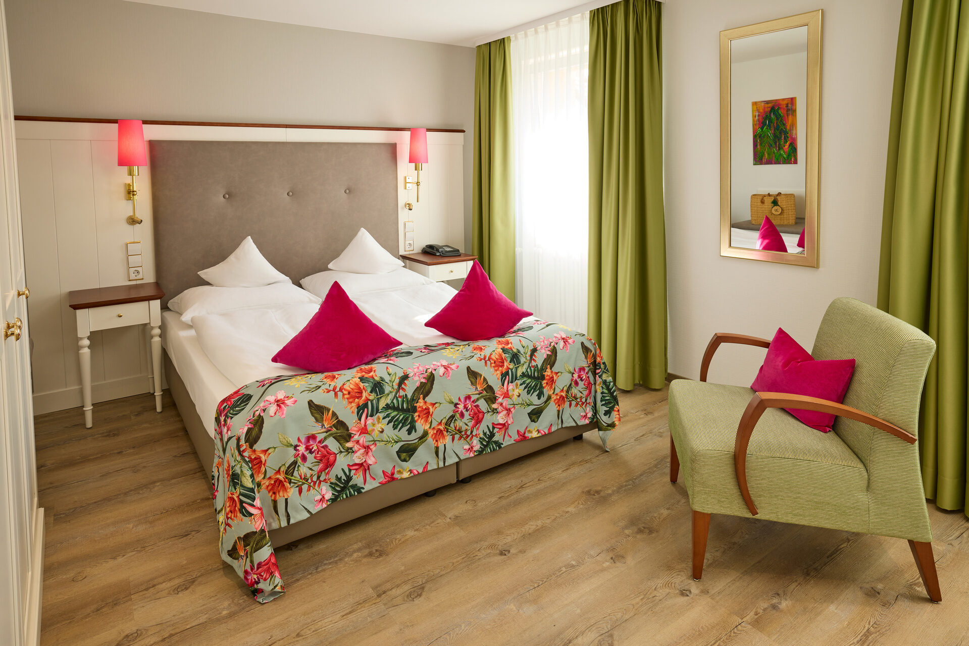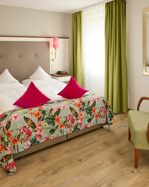 Unsere modern eingerichteten, großzügigen Zimmer im Golfhotel Grüner Baum im Renchtal, nur wenige Minuten von Oberkirch entfernt, bieten den idealen Rahmen, um den Alltag hinter sich zu lassen und die Zeit bewusst langsamer wahrzunehmen.