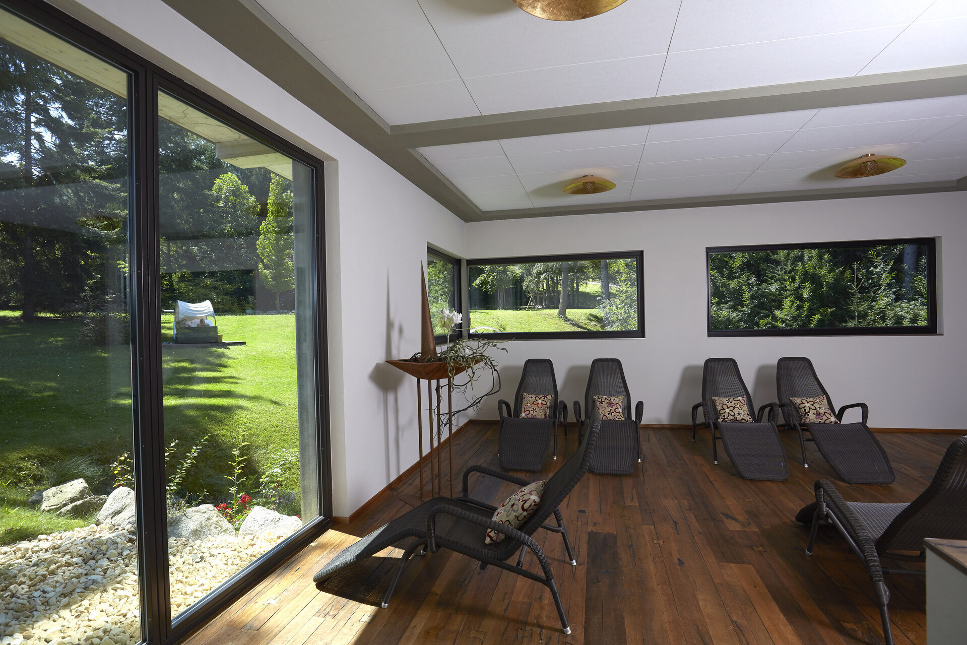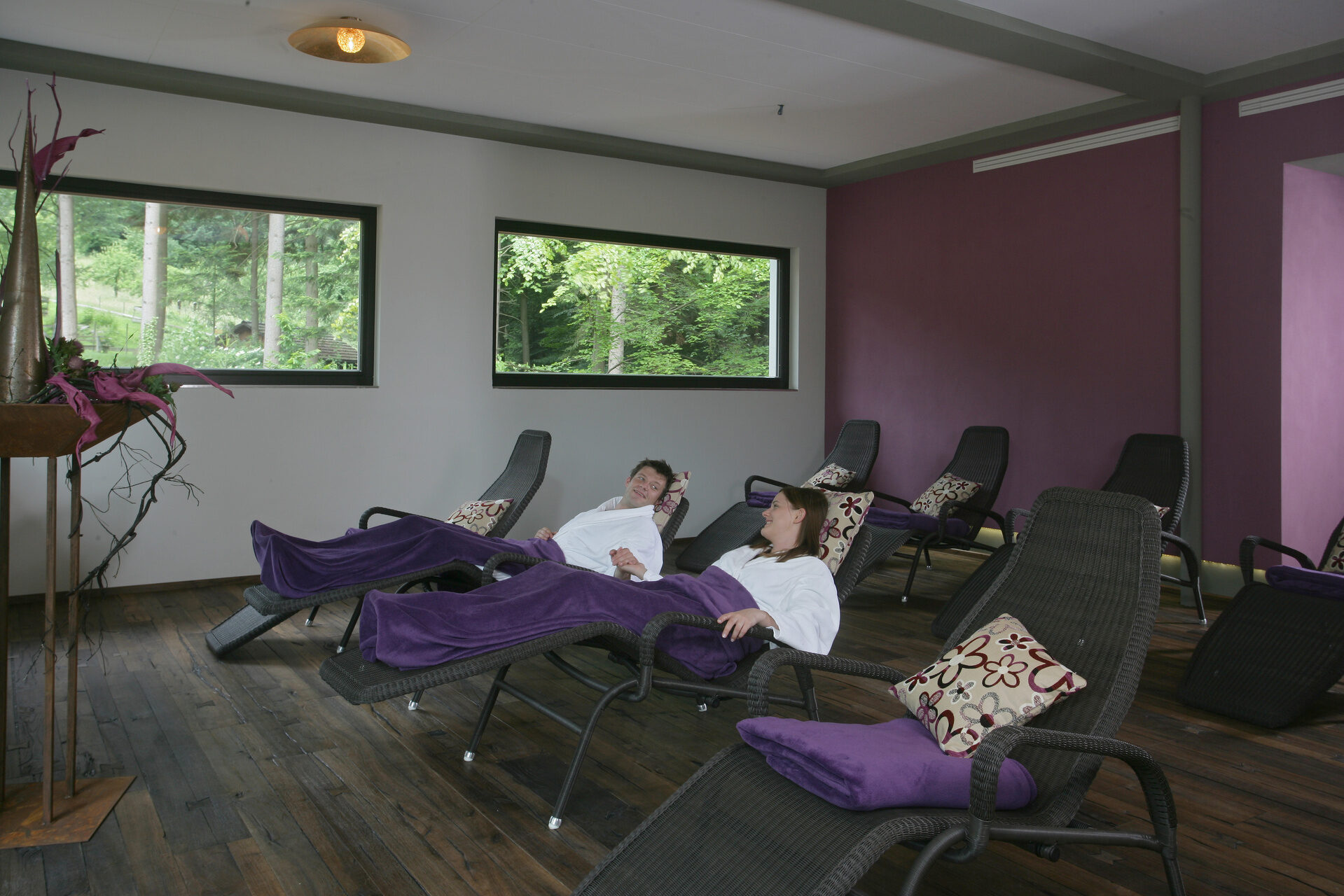 Nutzen Sie nach einem ausgiebigen Saunagang unsere modern eingerichteten Ruhebereiche. Ob mitten in der Natur oder bei Lichtatmosphäre mit Aussicht auf den Hotelgarten.